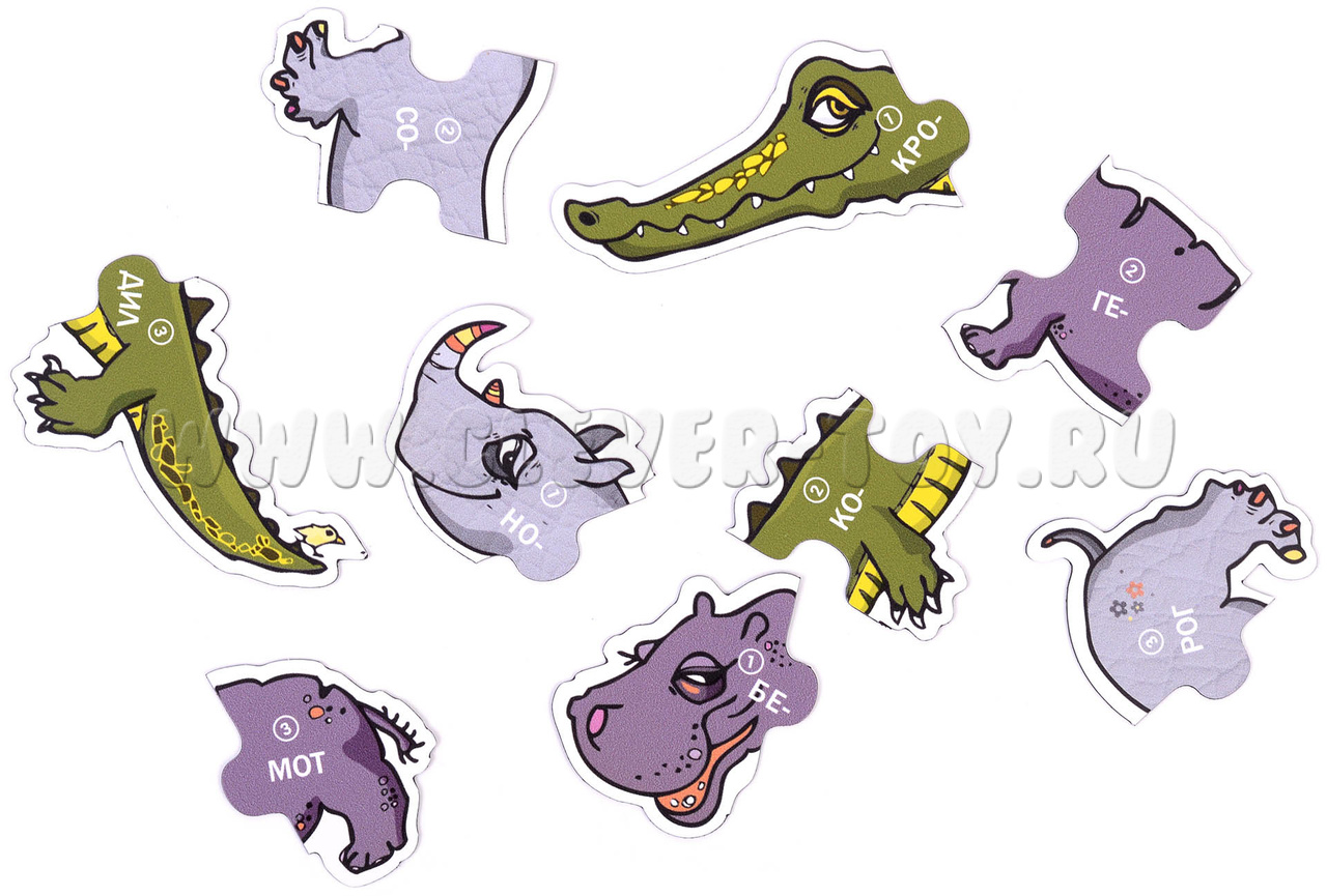 На поле нарисована жаркая Африка, в которой живут бегемот, крокодил, носорог. В нашем варианте каждый из них состоит из трех частей. Малыши должны правильно собрать этот забавный конструктор так, чтобы бегемот не был похож, допустим, на крокодила, а у носорога остался собственный, а не чужой хвост.