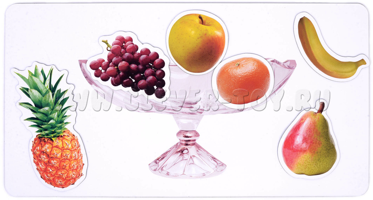 В комплект входят 8 магнитных полей двух размеров - 29 см х 24 см и 29 см х 15,5 см, - на каждом из которых изображён один из предметов: корзинка, кастрюля, банка или ваза. Дополняют набор 48 карточек разного размера с изображениями фруктов и овощей.