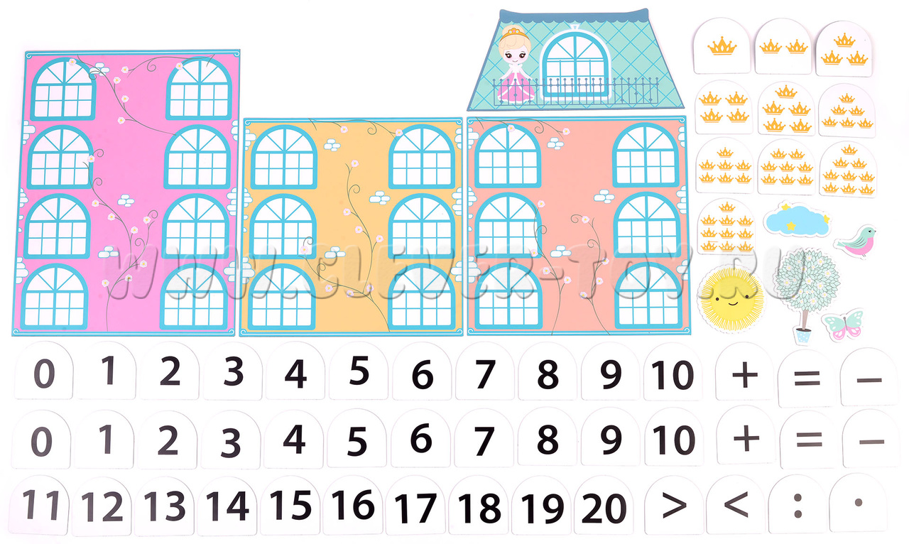 - Магнитные карточки с цифрами, знаками и коронами (соединяем абстракцию с предметным миром).