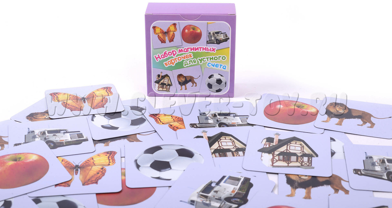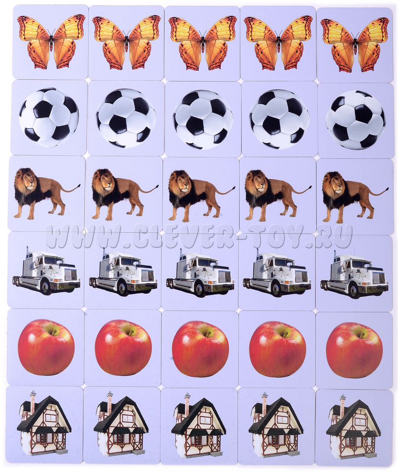 В наборе 30 карточек. Изображены 6 предметов: дом, яблоко, машина, лев, мяч, бабочка.
