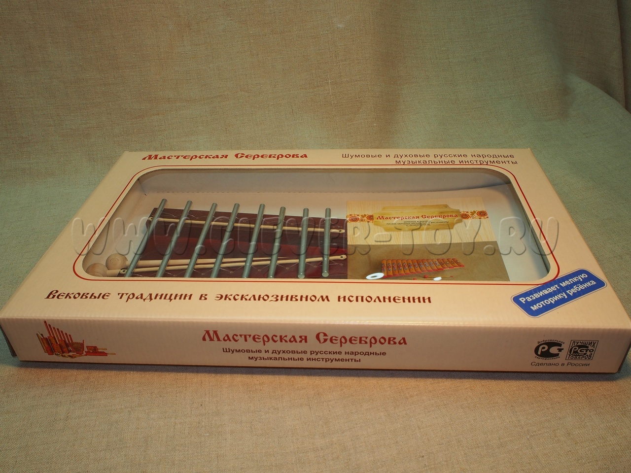 Металлофон изготовлен из 8 стальных прутков диаметром 6 мм, которые крепятся к резонатору. После закалки и гальванической обработки металл имеет мягкий, певучий и благозвучный голос.