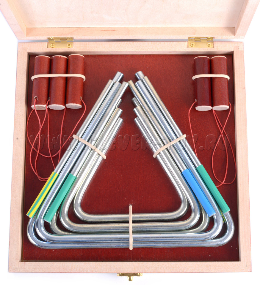 5 музыкальных треугольников (длина стороны - 10, 12, 14, 16, 18см) с качественной тембральной окраской, благородным и певучим звуком (до 20 секунд).