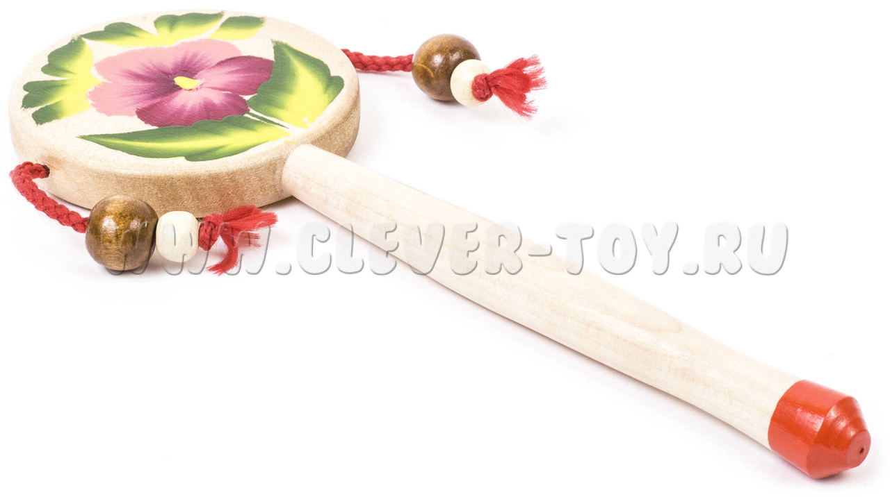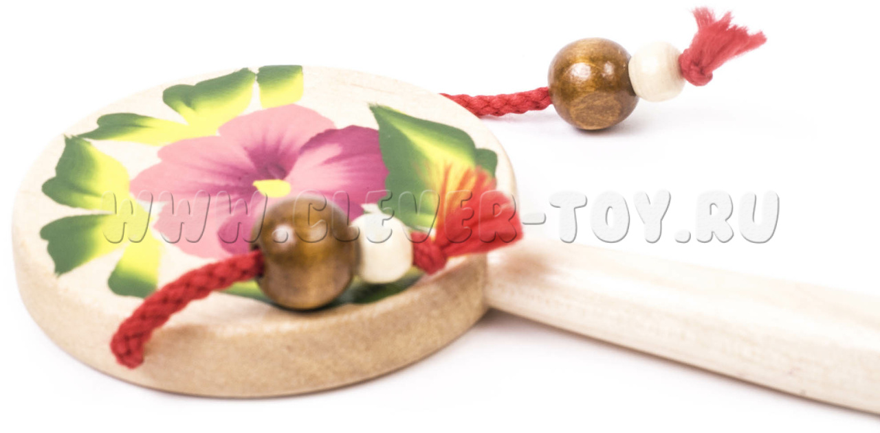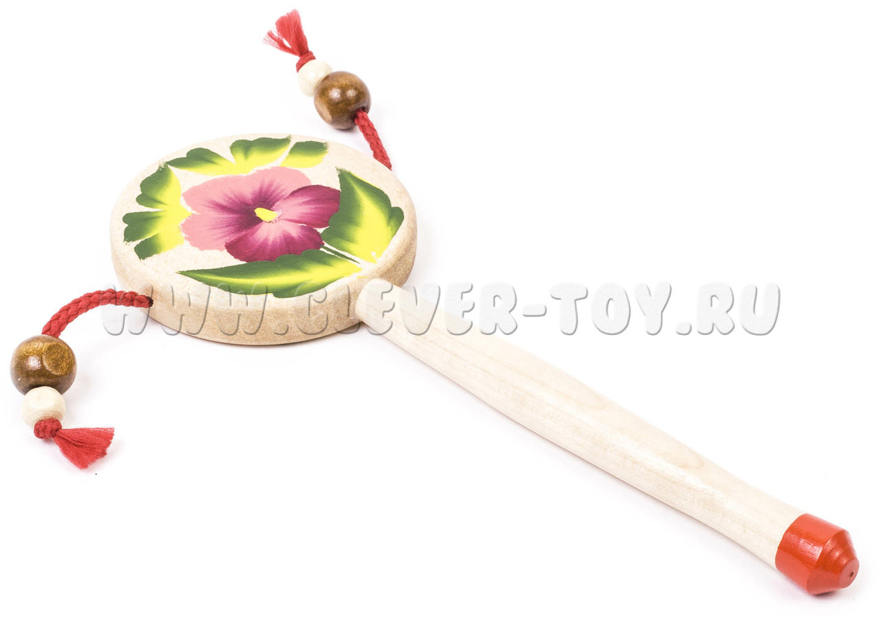 Представляет собой деревянный барабан диаметром 60 мм. В нижней части барабана клеевым способом крепится ручка диаметром 12 мм, длиной 110 мм. По бокам круглого барабана посредством капронового шнура крепятся деревянные бусинки диаметром 8 мм. С обеих сторон барабана нанесена роспись. Материал: береза.