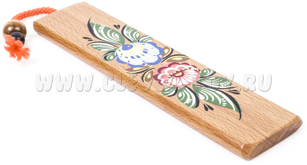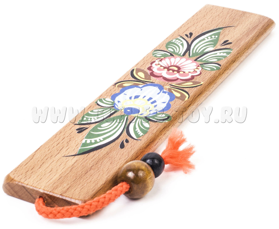 Колотушка с росписью для самых юных музыкантов представляет собой деревянный брус размерами: 140 мм х 30 мм х 5 мм. В верхней части бруса посредством капронового шнура крепится бусинка диаметром 16 мм. На сторонах в 140 мм нанесена роспись. Материал: бук, береза.