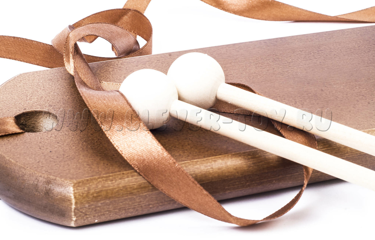 Пастуший барабан представляет собой деревянный щит размером 230х100х20 мм. По краям сделаны отверстия для крепления атласной ленты. Инструмент комплектуется двумя ударными палочками.