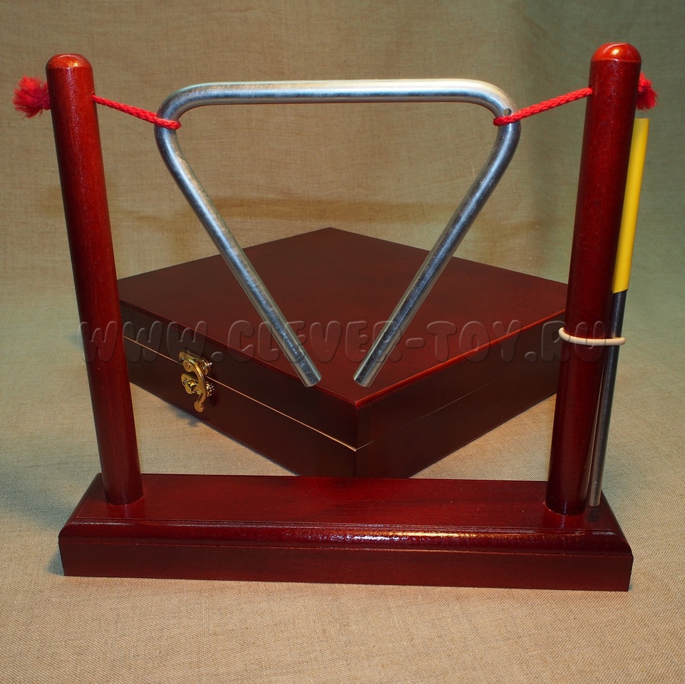 Треугольник выполнен из стали диаметром 8мм, длина стороны - 14см. Гальваническое покрытие не ухудшает качество звука и не разрушается при механическом воздействии. Треугольник закреплен на деревянном основании. Ударная палочка из нержавеющей стали. Подарочный кейс с золочеными застежками.
