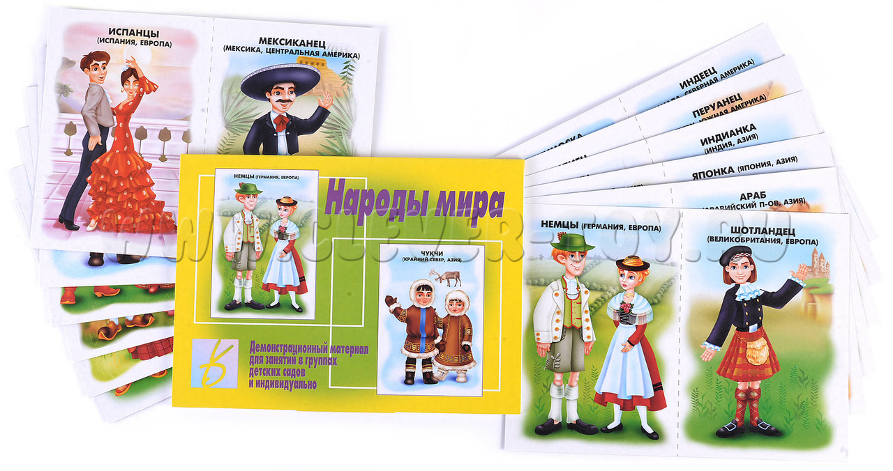 Список карточек (национальностей): Алжирцы, Американец, Араб, Греки, Индеец, Индейцы, Индианка, Испанцы, Маори, Масаи, Мексиканец, Немцы, Папуас, Перуанец, Русские, Саамы, Сицилиец, Турки, Чилиец, Чукчи, Шотландец, Эскимоска.
