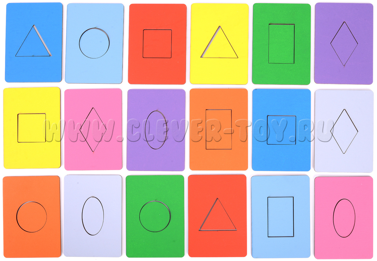 В комплект входят 18 планшеток с выемками в виде квадратных, овальных, круглых, прямоугольных, ромбовидных и треугольных форм.