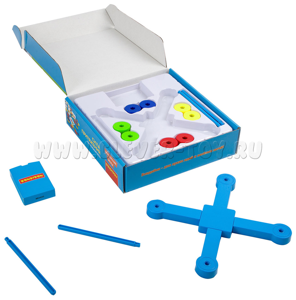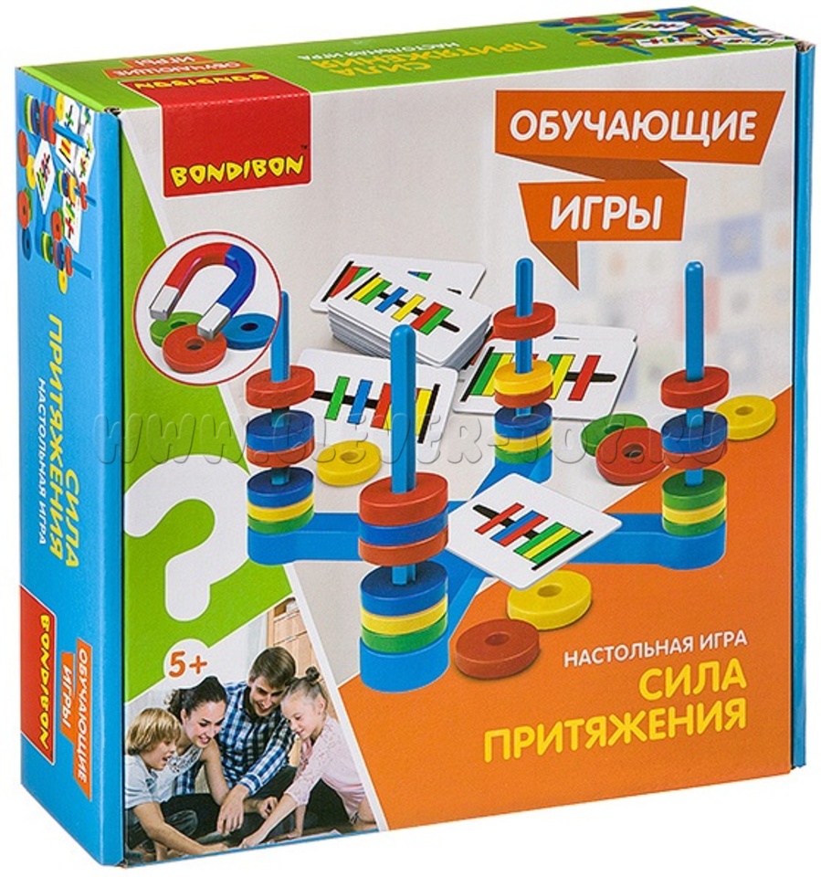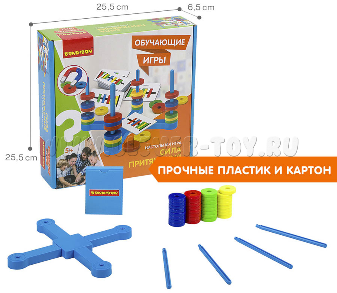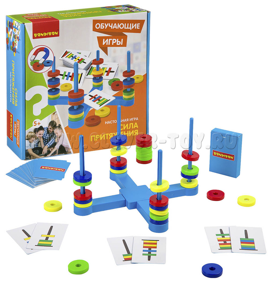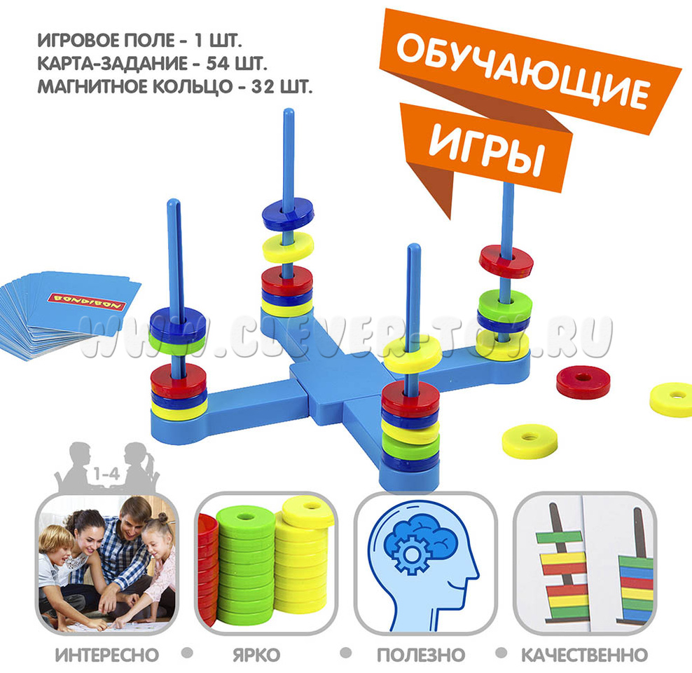 Откройте карту-задание из колоды. На скорость повторите комбинацию, указанную на ней, учитывая притяжение и отталкивание магнитов. Кто первым выполнит задание - забирает карту. 5 заработанных карт - победа!