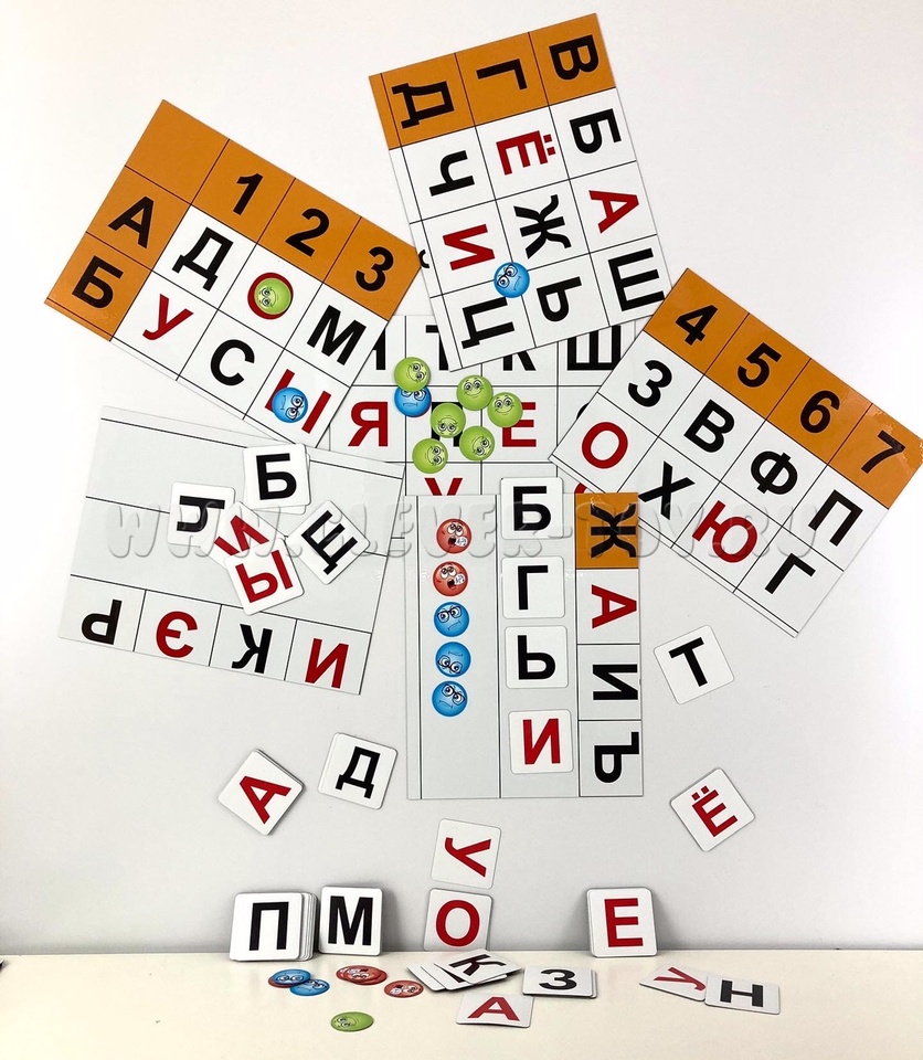 В комплекте 71 магнитные карточка с буквами, 1 пустая карточка, 30 магнитных смайлов.