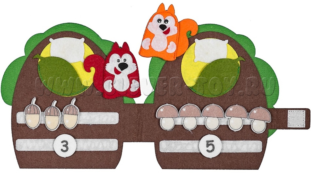 4. Учите малыша работать по речевой инструкции. Например, положи белке слева три грибочка, а белке справа 2 желудя.