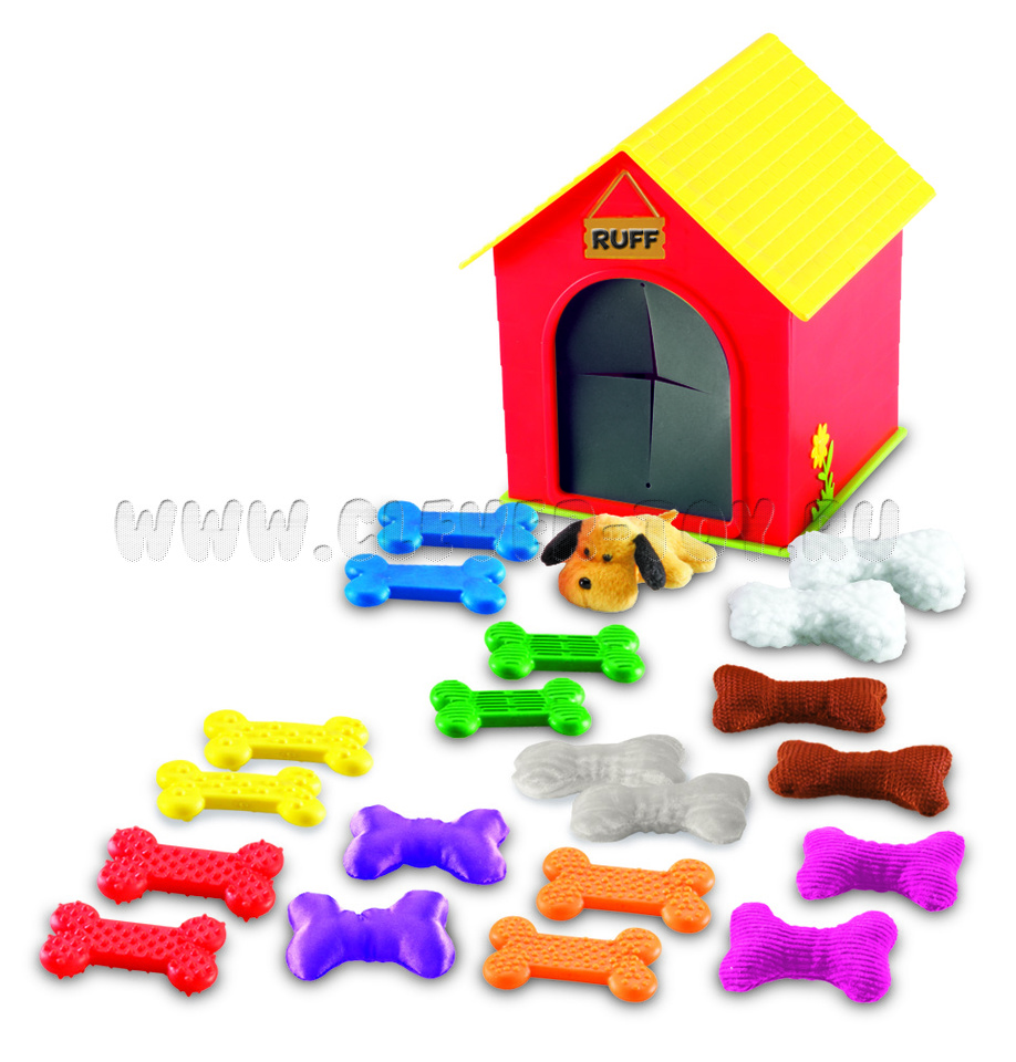 Прекрасный способ стимулировать детское осязание! Помогите пушистой собачке найти различные текстурированные кости: гладкие, шелковистые, грубые, неровные, ребристые и т.п.