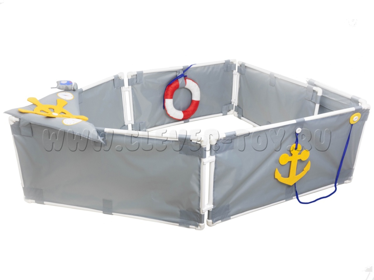 Нос корабля 1 штука - треугольная деталь серого цвета (равнобедренный треугольник, у которого основание 88 см, а две другие стороны 59 см) с наклейками, резинкой для рации и рацией, штурвалом из фетра желтого цвета пристегивающимся на пуговицу.