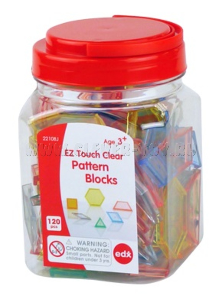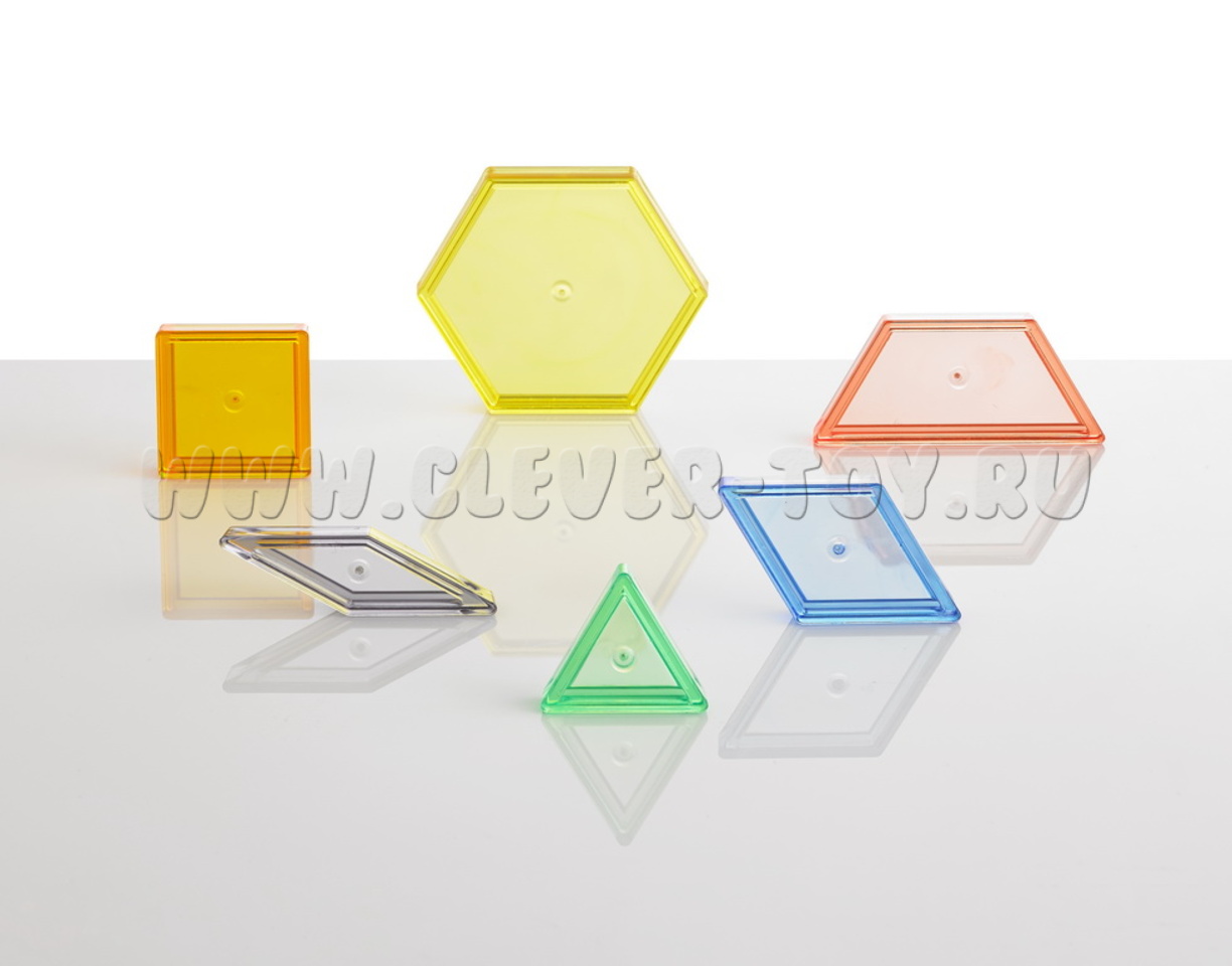 Игровой набор состоит из 120 прозрачных элементов 6 форм в 6 ярких цветах (12 желтых шестиугольников, 12 оранжевых квадратов, 24 зеленых треугольника, 24 красных трапеции, 24 синих ромба и 24 серых ромба).