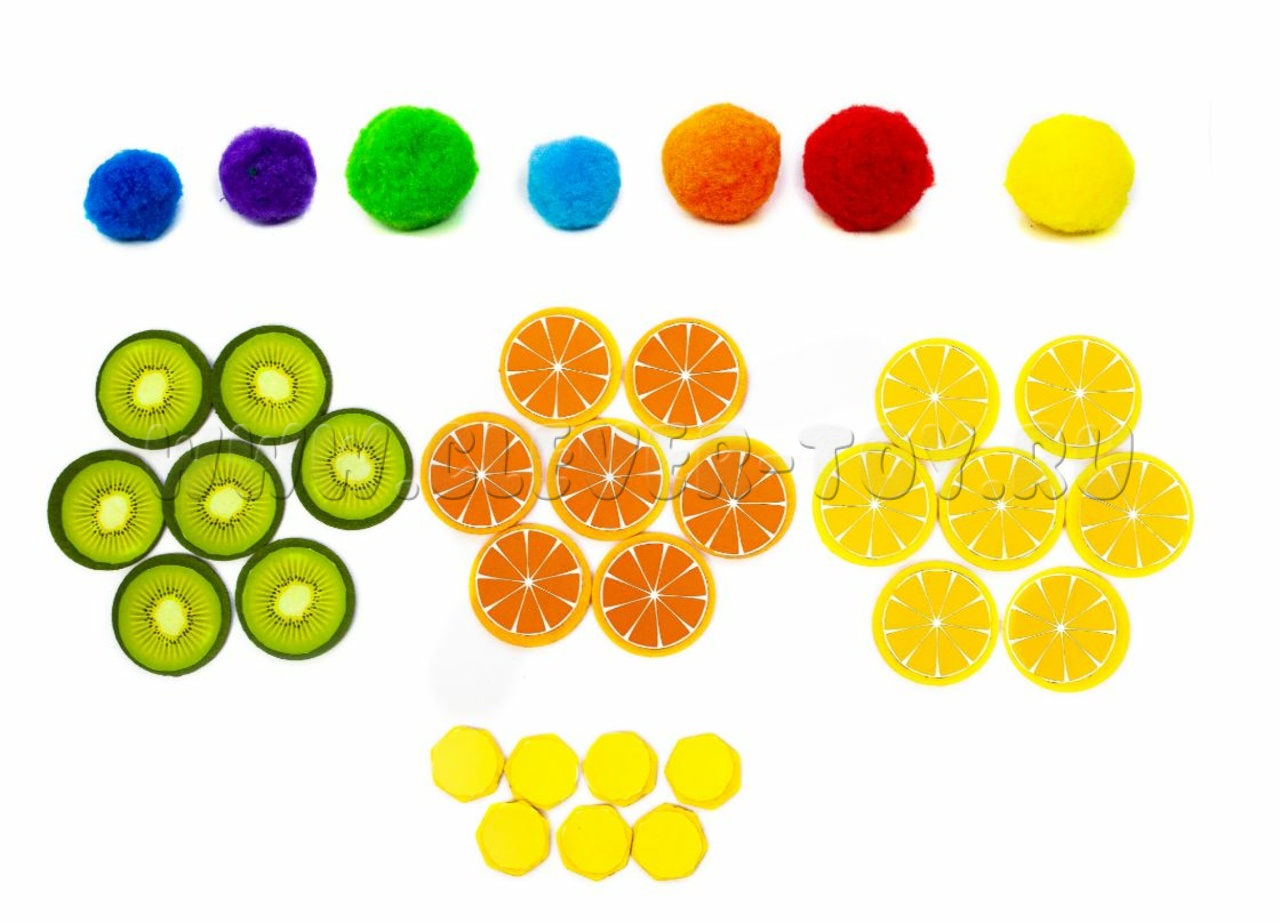 - 7 кусочков торта по цветам радуги, украшеия для торта: 7 бананов, апельсинов, киви и лимонов, 7 помпонов (зефирки) цветов радуги,