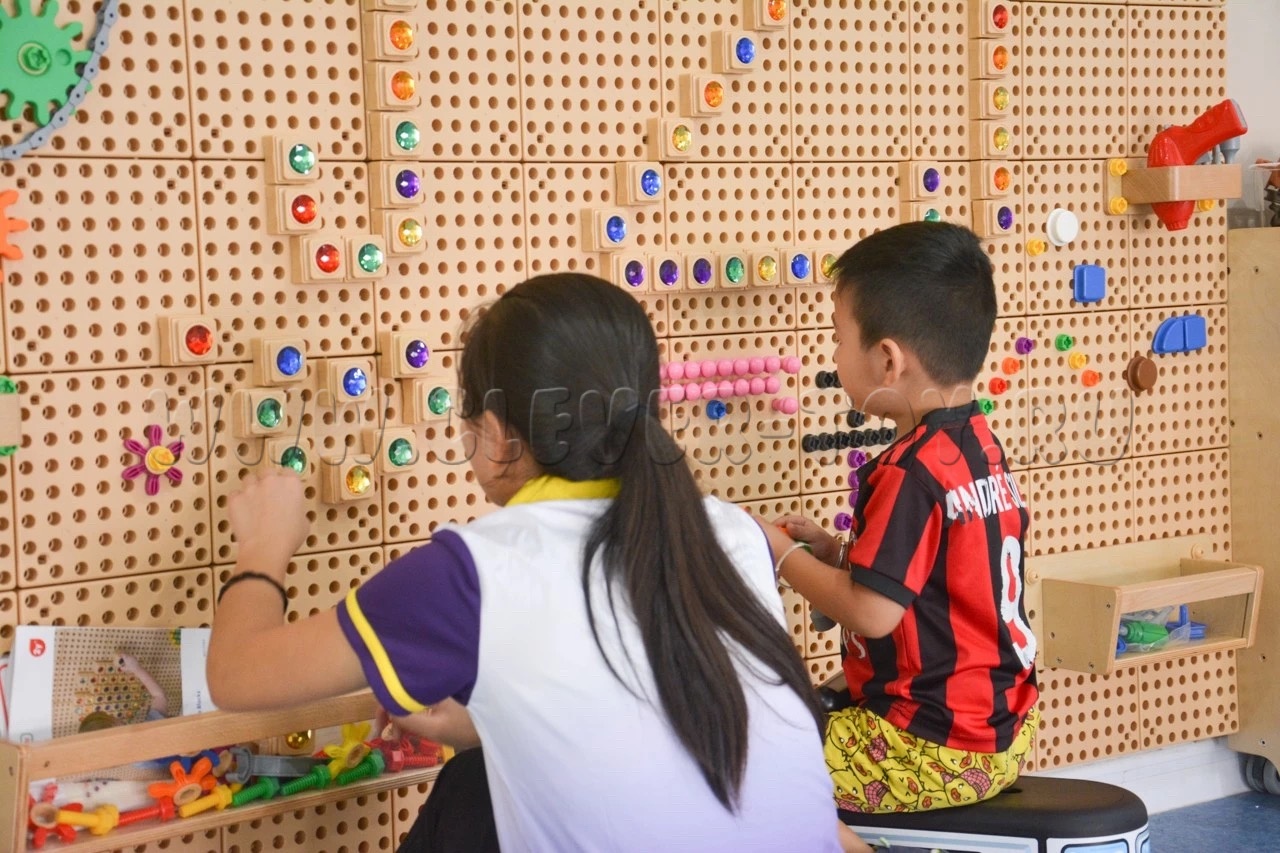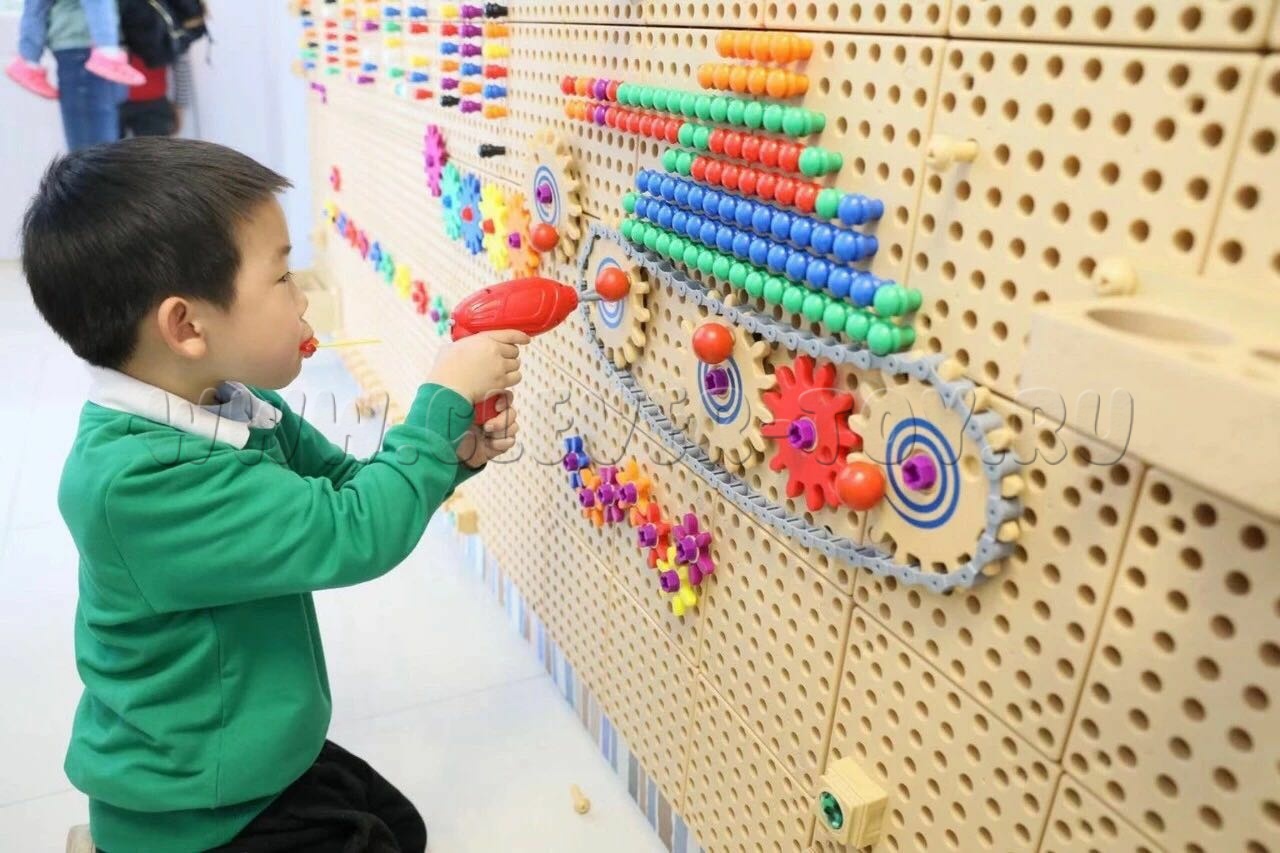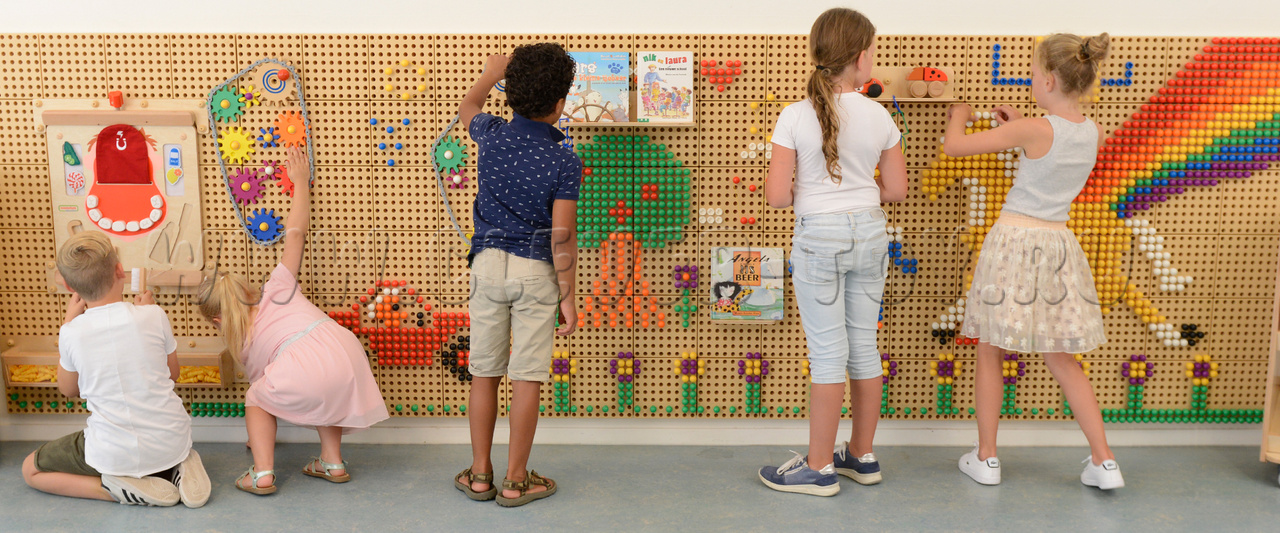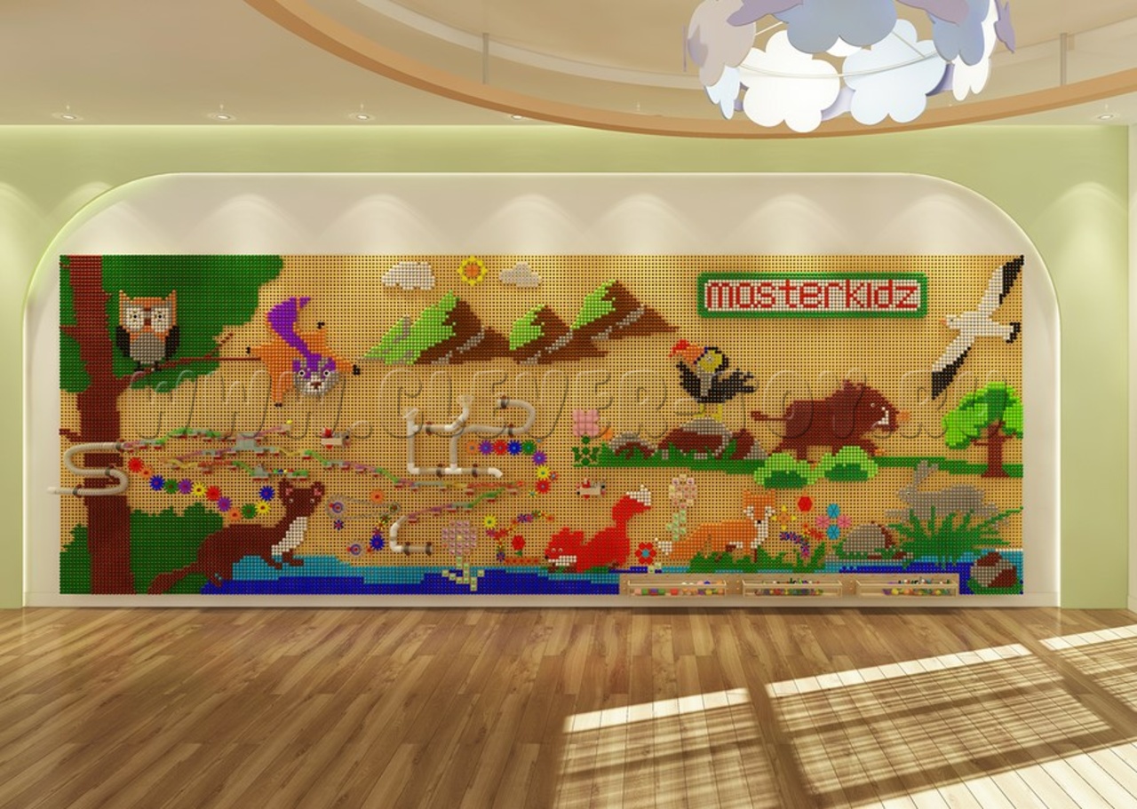 STEM-стена имеет возможность установки развивающих образовательных комплектов Masterkidz, таких как колышки, сокровища, шнуровки, винты, кинетические треки, развивающие панели и множество других интересный пособий, которые обеспечивают постоянные новые задачи и позволяют детям  ежедневно получать новый опыт и совершать новые открытия. Таким образом обычная стена превращается в супер-игрушку для веселого и интерактивного обучения!